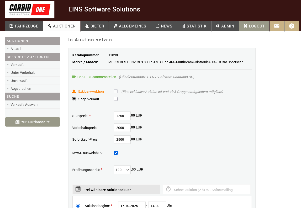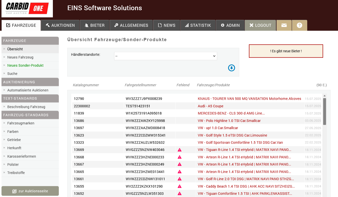 CarBidOne ist eine individuelle online Auktions-Plattform für Autohäuser im Bereich Remarketing von Gebrauchtwagen. Der Handel erfolgt direkt an die Autohändler und ohne Zwischenhandel. Für Aufkäufer ist die Teilnahme an Auktionen von Seiten der E.I.N.S. kostenfrei, so dass sich höhere Deckungsbeiträge als bei anderen Plattformen erwirtschaften lassen. CarBidOne bietet einen günstigen Preis / Auktionsgebühr pro Fahrzeug und dieser wird auch nur dann fakturiert, wenn es in einer Auktion auch mindestens ein Gebot eines Aufkäufers gab.