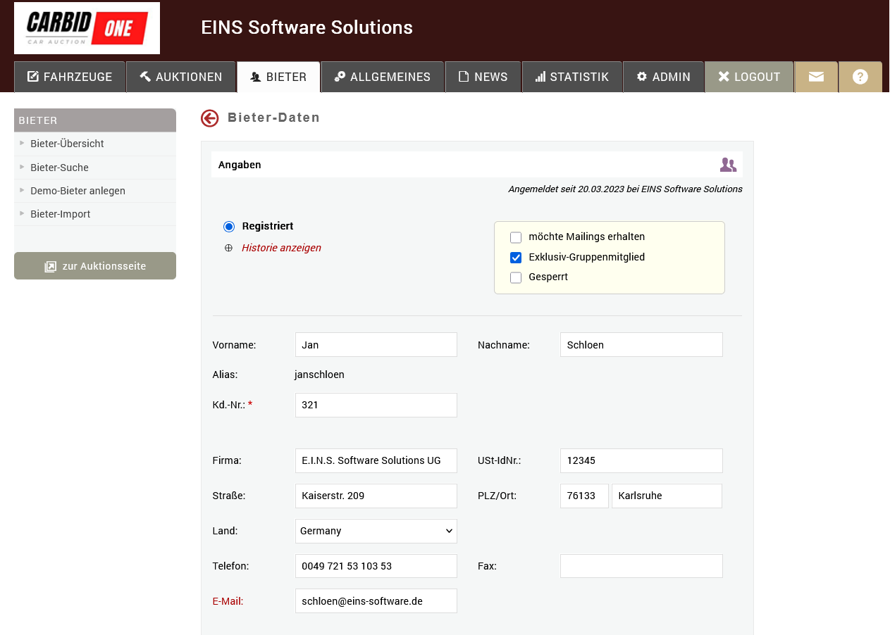 Als CRM bietet CarBidOne die Verwaltung der Aufkäufer, die an Auktionen teilnehmen (wollen). Diese registrieren sich direkt beim CarBidOne-System eines Autohauses.