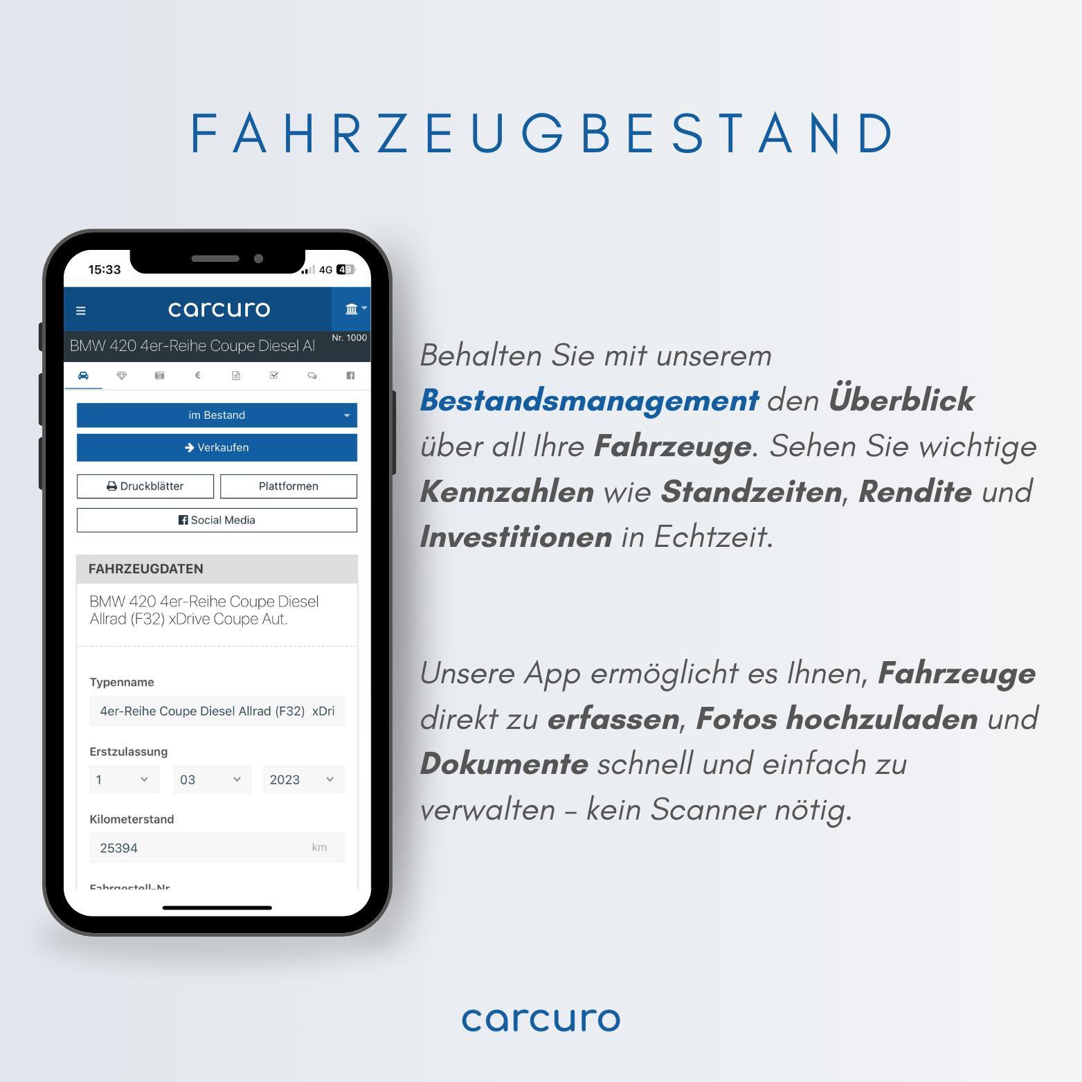 Carcuro bietet umfangreiche Verkaufsstatistiken, Umsatzberichte und Margenanalysen, die Händlern einen schnellen Überblick über ihre Geschäftsentwicklung ermöglichen. Eine direkte Anbindung an Bankkonten ist derzeit nicht vorgesehen, jedoch unterstützt Carcuro durch integrierte Auswertungen eine transparente und effiziente Finanzübersicht. So behalten Händler ihre Zahlen jederzeit im Blick und können fundierte Entscheidungen treffen.