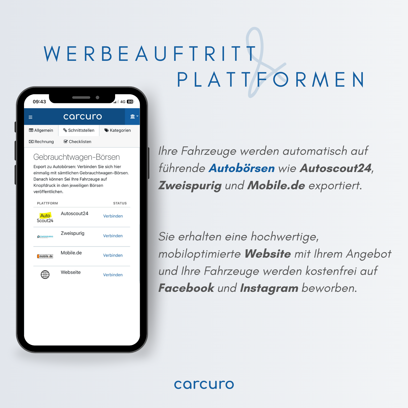 Carcuro verfügt über zahlreiche Schnittstellen zu wichtigen Plattformen und Tools im Autohandel. Dazu gehören Fahrzeugbörsen wie mobile.de und AutoScout24, Bild- und Marketinglösungen wie Carmera oder Autofox.ai sowie Exportmöglichkeiten in verschiedenen Formaten, beispielsweise für DATEV. Zusätzlich sind digitale Preisschilder von Visi/One integrierbar – so lassen sich Arbeitsabläufe nahtlos verknüpfen und der Aufwand für den Händler erheblich reduzieren.